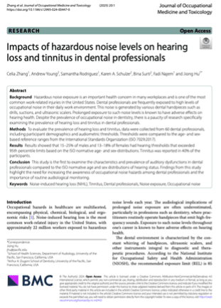 Hot off the press! Faculty members in Audiology and Dental recently published their research in the Journal of Occupational Medicine and Toxicology. This collaborative project revealed that 13-25% of dental professionals had hearing thresholds surpassing the 95th percentile limits according to normative age and sex distributions. Third-year Audiology student and co-author, Samantha Rodriguez, has presented the findings at state and national conferences. Thank you to all the authors for their contribution and hard work! Click here to read their work!